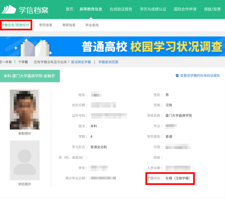 登录学信档案,进入“高等教育信息→学籍信息”页面,仔细核对姓名、性别、出生日期、证件号码、民族、专业、录取照片(注意:学历照片暂无需核对)。若学籍状态显示为“在籍(注册学籍)”,即表示学籍注册成功。信息确认无误后,关闭页面即可完成自查。