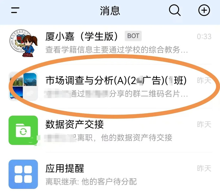 登录企业微信,在【消息】中仔细核对已加入的“在线课程班”群,确认与本人本学期课表是否完全一致。